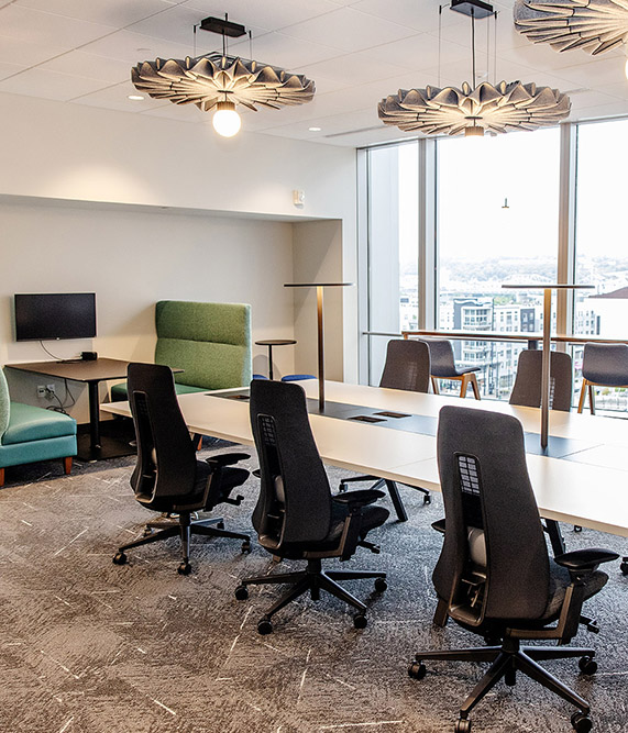 Workstation Enhancements: Individual workstations feature ergonomic furniture, multi-use charging stations, wireless connectivity and plenty of natural light to create a comfortable and productive environment. Additionally, noise reducing/absorbing materials help ensure a quiet workspace.